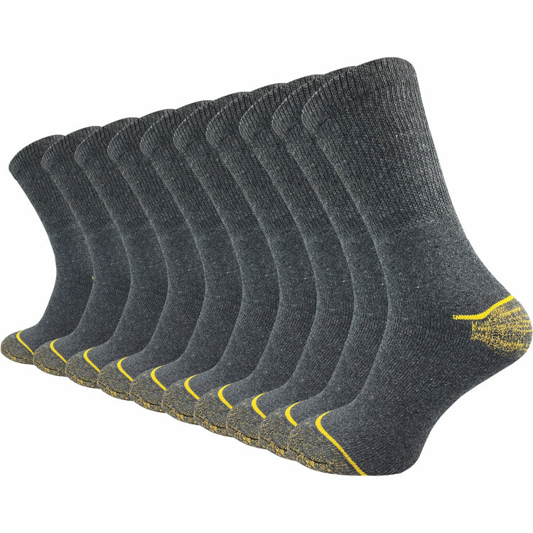 Lange Haltbarkeit dank verstärkter Belastungszonen an Ferse & Spitze Diese Arbeitssocken für Herren bieten optimalen Tragekomfort und langanhaltende Haltbarkeit. Das besondere Merkmal dieser Socken ist der Komfortbund ohne Gummi, der sich angenehm anpasst und nicht einschneidet. Die spezielle Konstruktion des Komfortbunds gewährleistet einen bequemen Sitz, ohne dabei die Haut zu belasten. Die Socken sind besonders langlebig dank der verstärkten Belastungszonen an Ferse und Spitze. Diese verstärkten Bereiche sorgen für eine längere Lebensdauer, insbesondere bei regelmäßiger Beanspruchung, beispielsweise in Sicherheitsschuhen. Ein angenehmes Fußklima wird durch den Materialmix mit 71% Baumwolle ermöglicht. Dieser sorgt für eine gute Luftzirkulation und verhindert unangenehme Schweißfüße. Mit diesem praktischen 10er-Pack sind Sie bestens ausgestattet, um die Arbeitswoche komfortabel zu bewältigen.