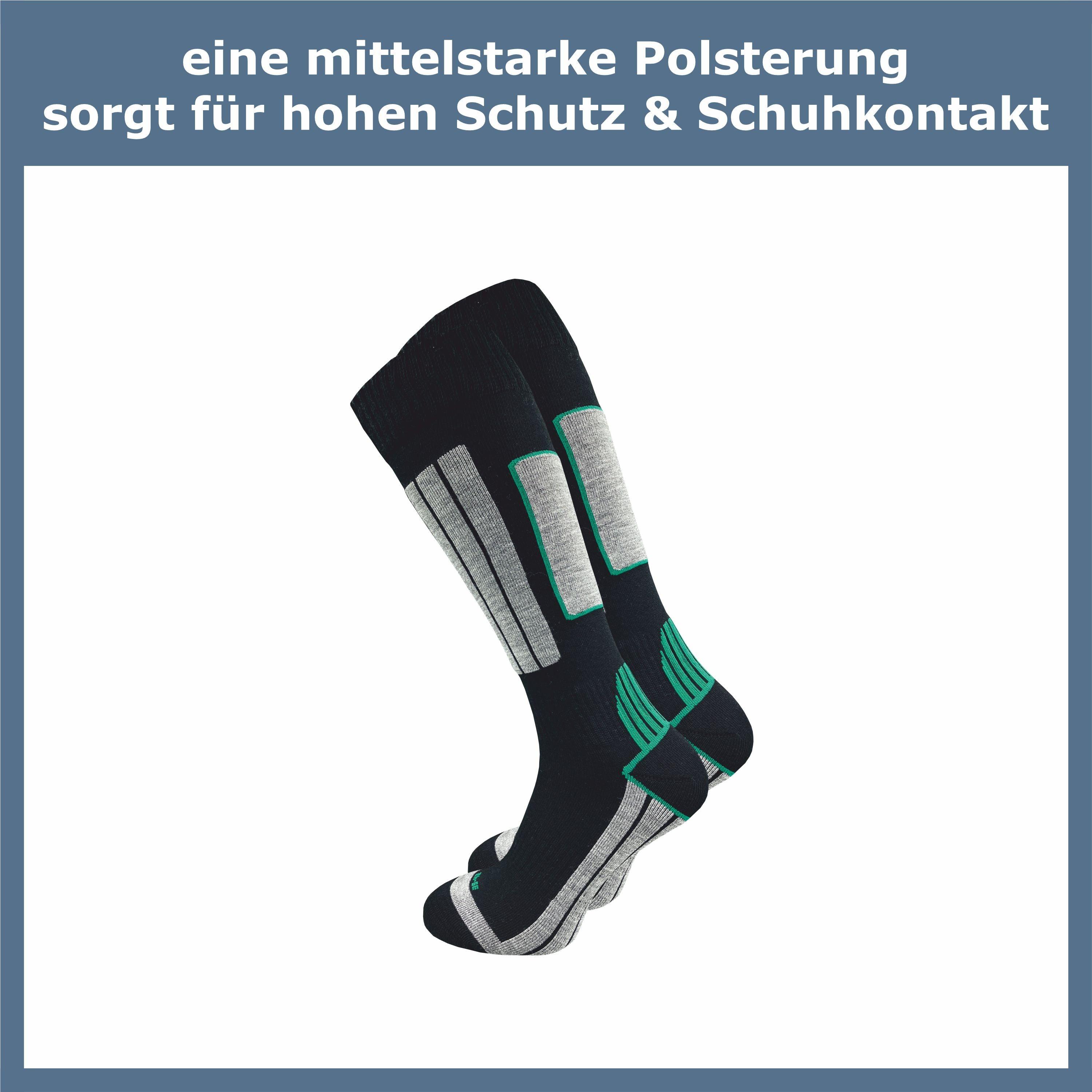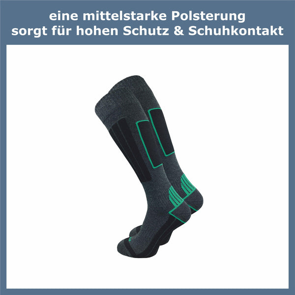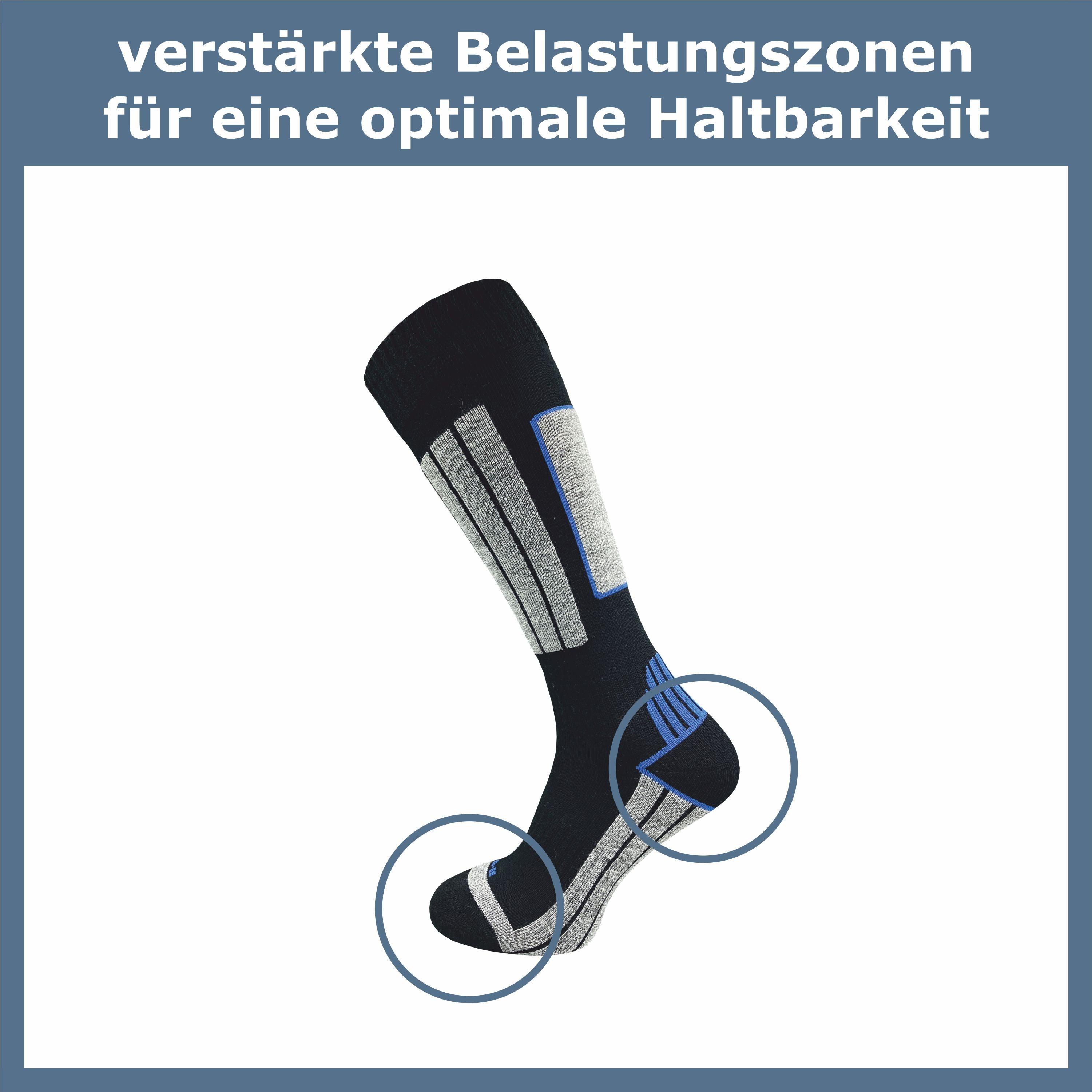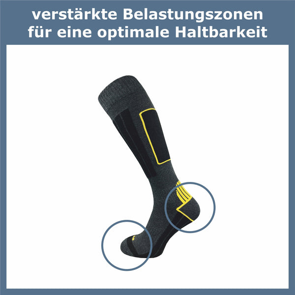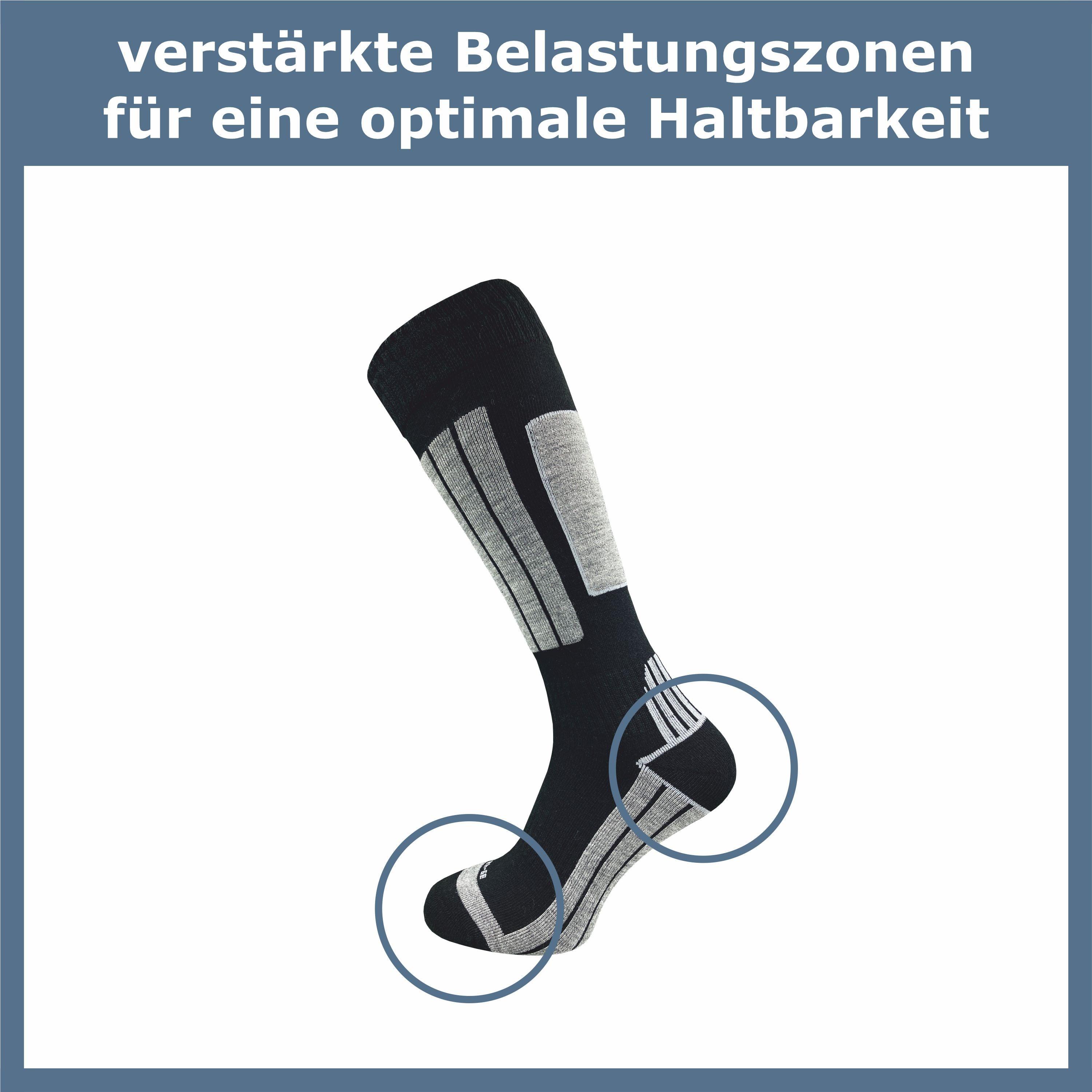 - EXTRA LANGLEBIG: Verstärkte Belastungszonen an Ferse und Fußspitze sorgen für eine lange Haltbarkeit der Skistrümpfe für Herren. Durch den Einsatz von Elasthan sitzt die Skisocke perfekt und angenehm.