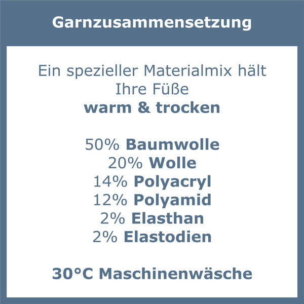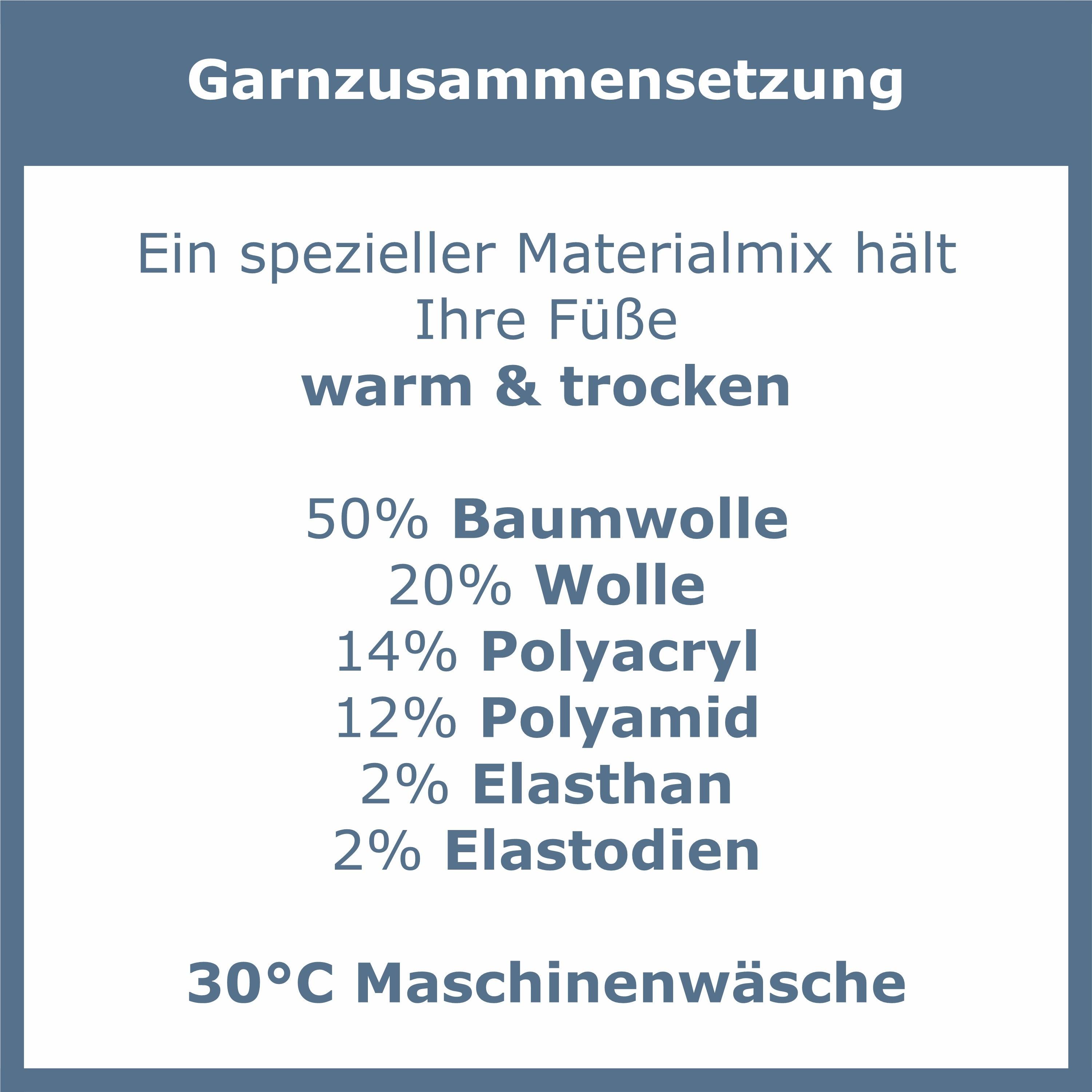 - FUNKTIONSSOCKEN MIT SPEZIELLEM MATERIALMIX: Der spezielle Materialmix hält Ihre Füße dank klimaregulierender Fasern warm & trocken. Waschmaschinenfest - nicht einlaufend - nicht filzend.
